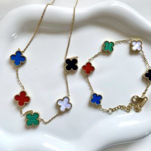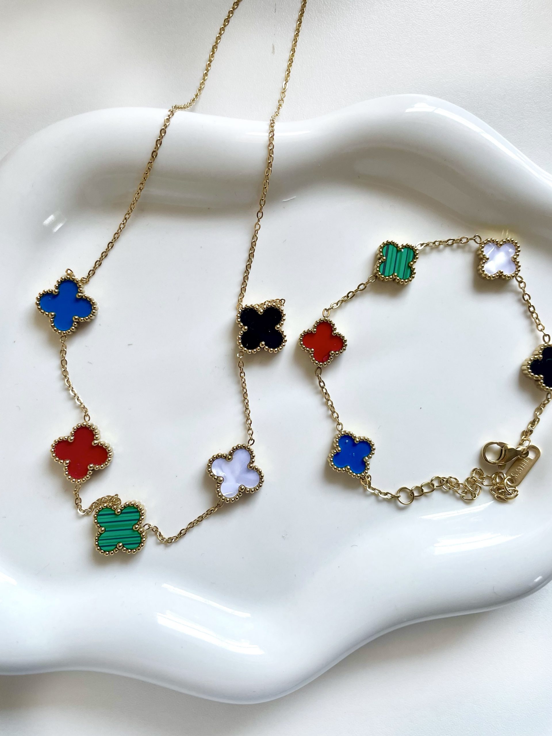 Trendy Multi-colour Clover Leaf Stainless Steel Bracelet with Necklace