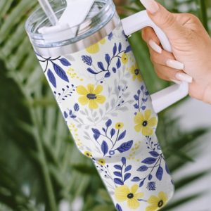 Beau Blue Flower Pattern Handle Cup with Straw