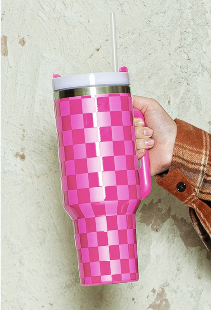 Bright Pink Checkered Print Stainless Steel tumbler -40oz